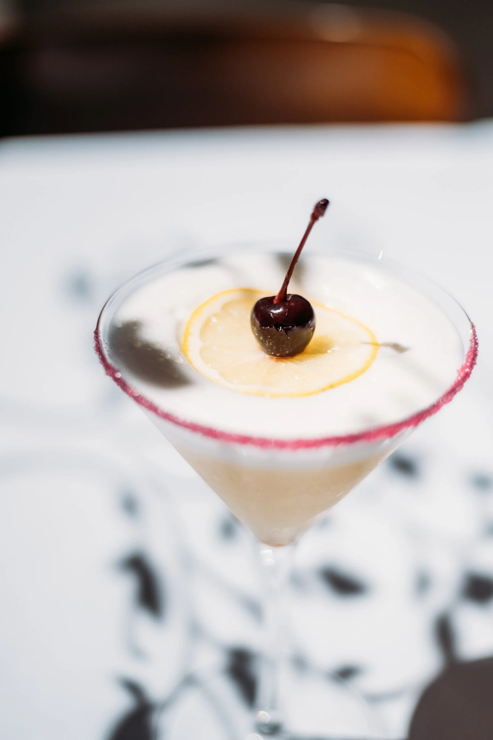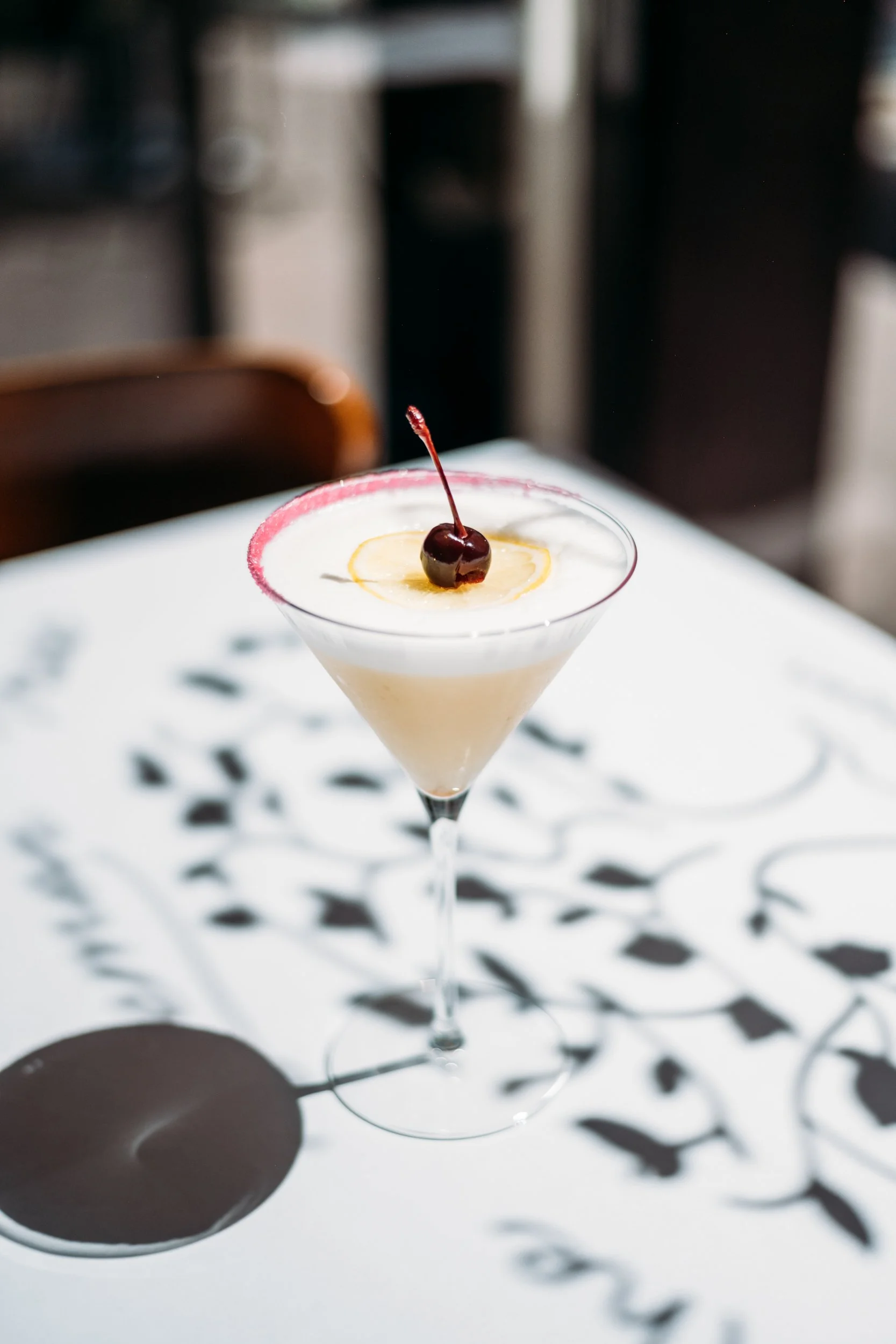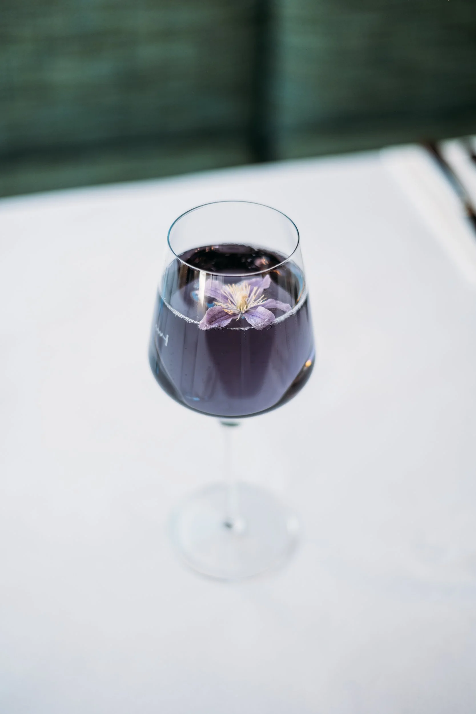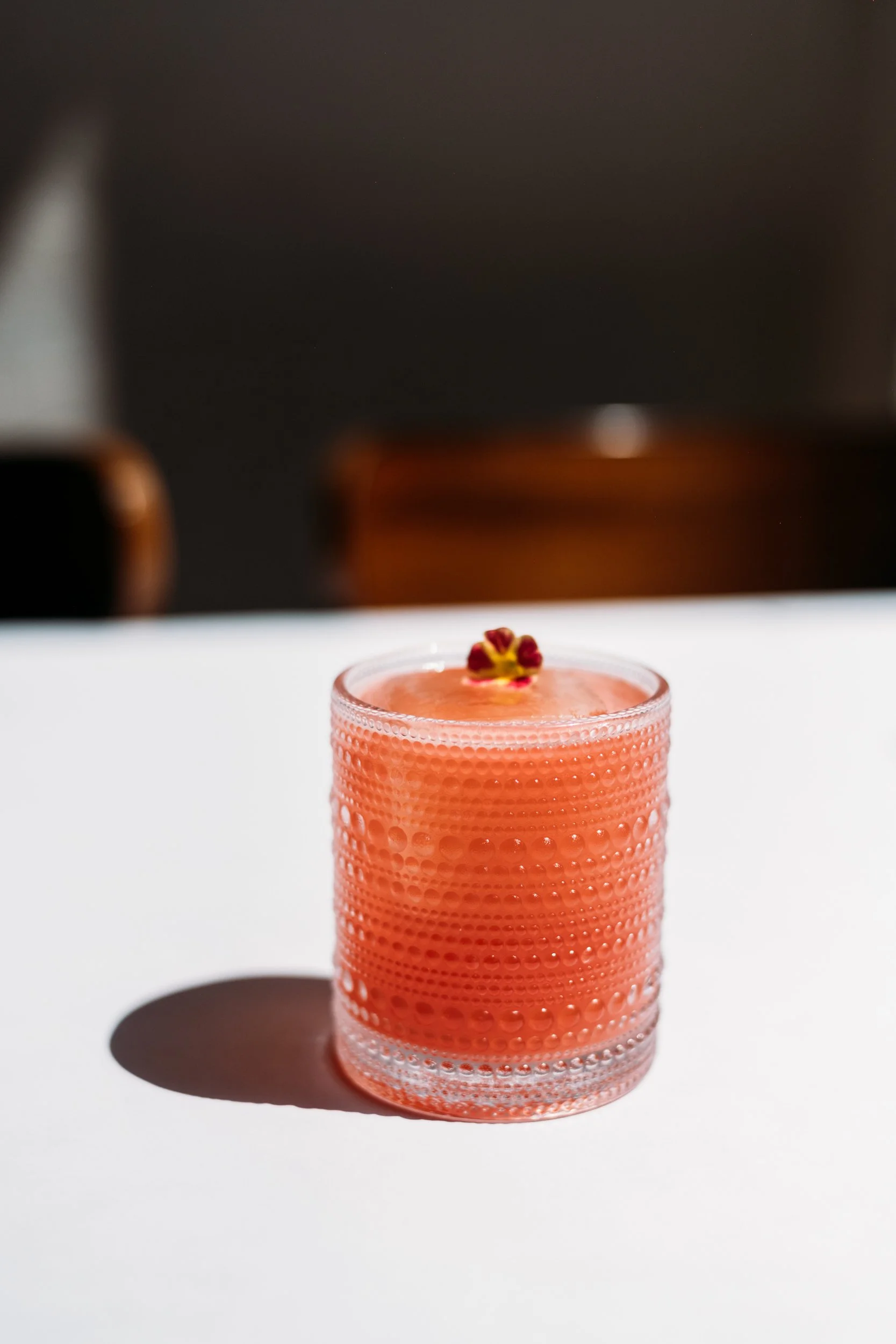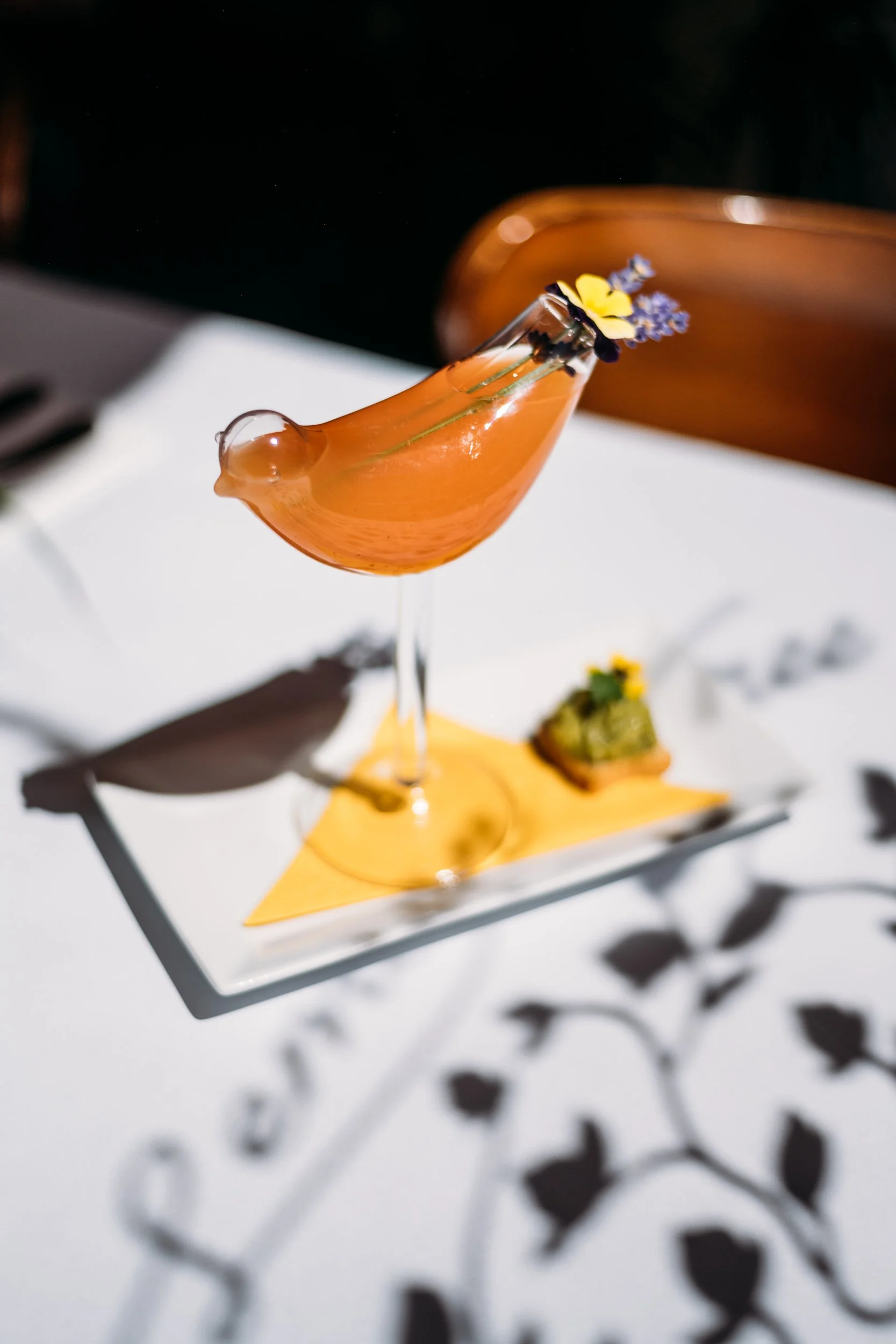 passionfruit cocktail with edible flower garnish on white table at lemon tree bend oregon