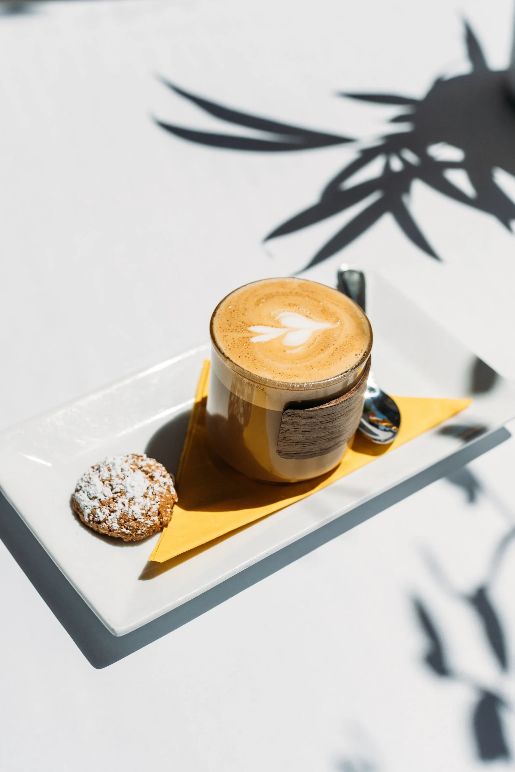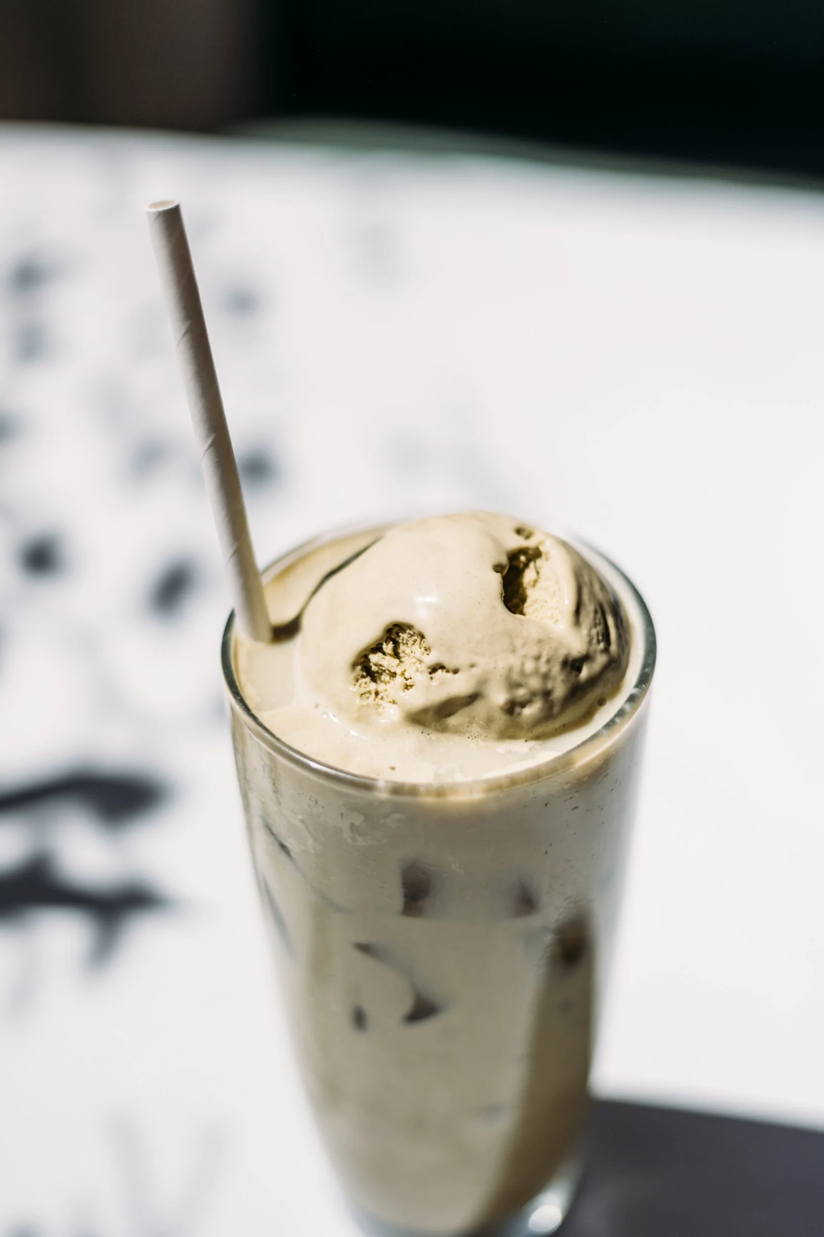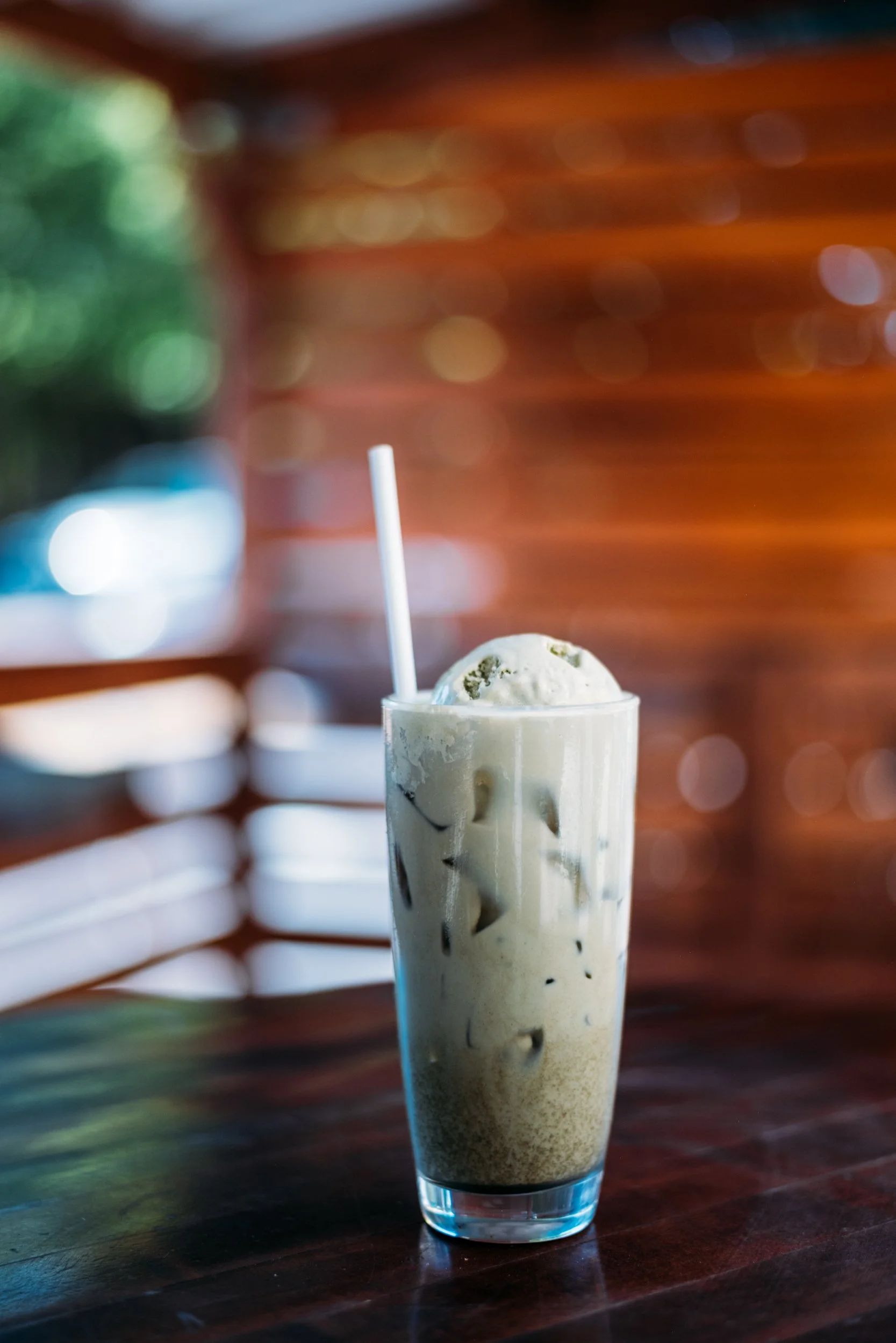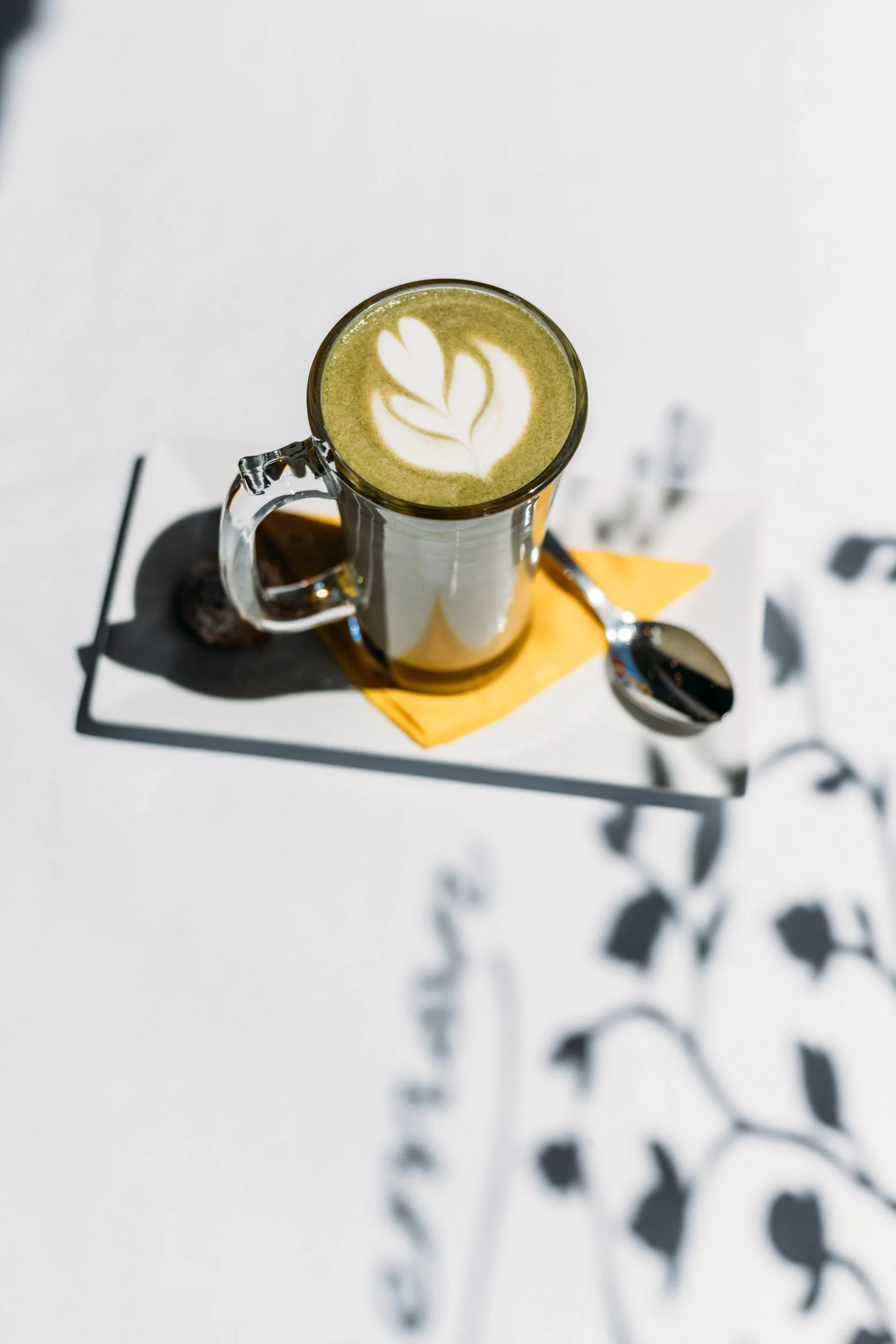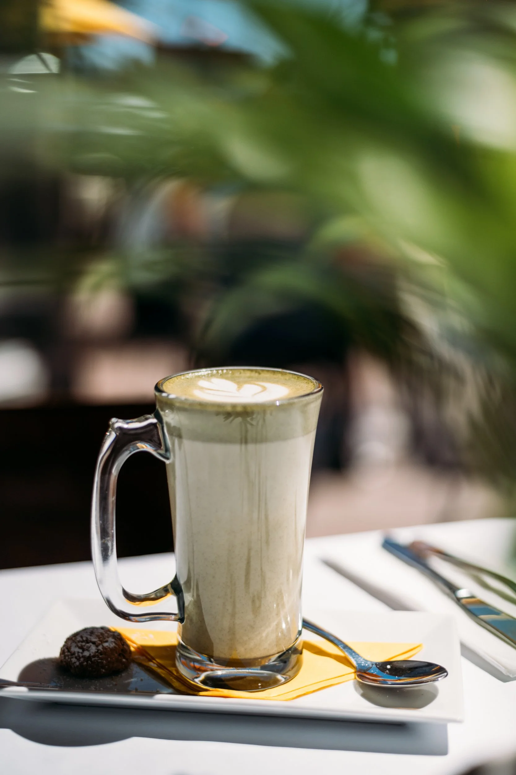 espresso martini on a blue background in warm sunlight brunch restaurant in bend oregon