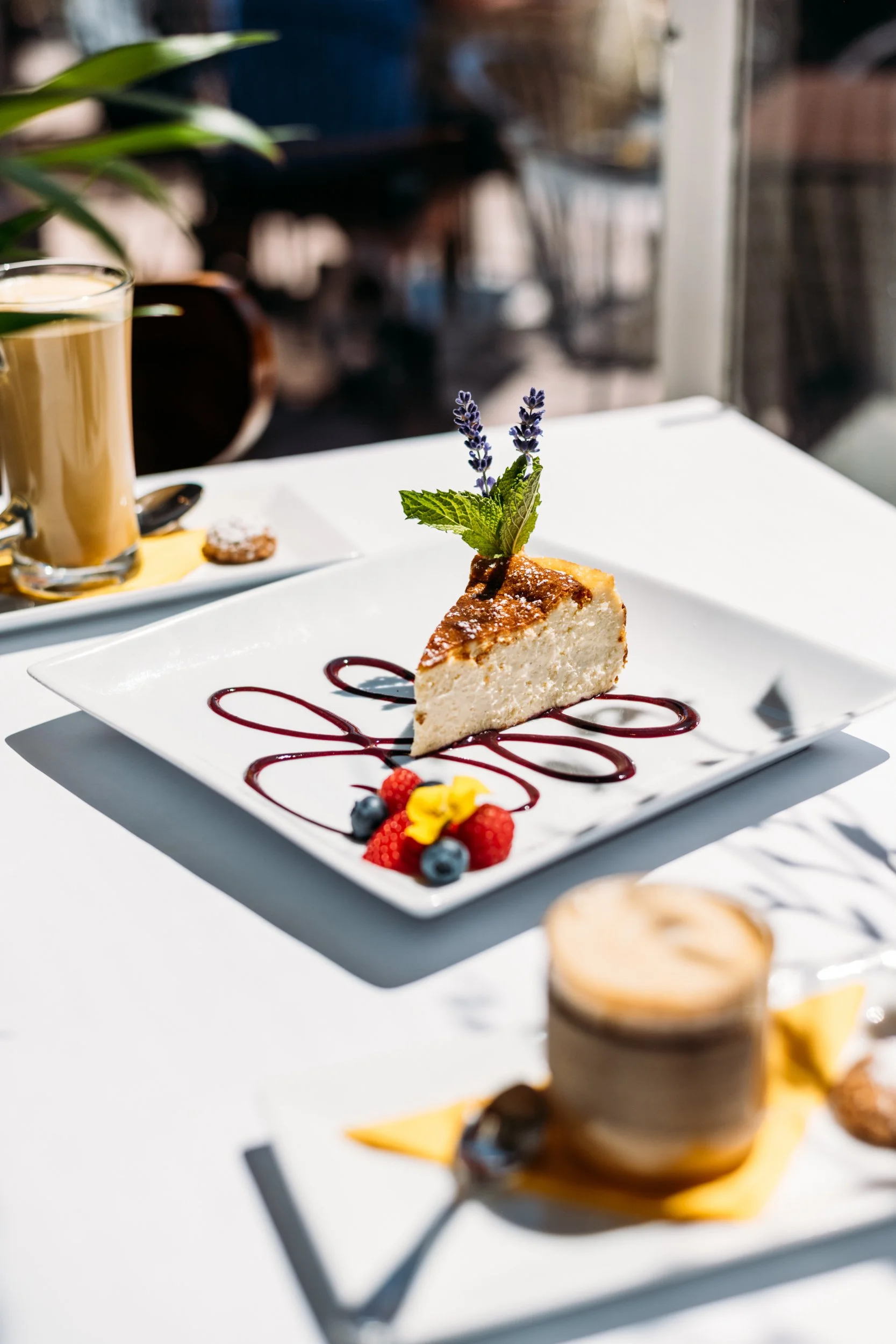 waiter holding a plate of lemon cheesecake garnished with fresh berries for dessert at a dinner event in bend oregon